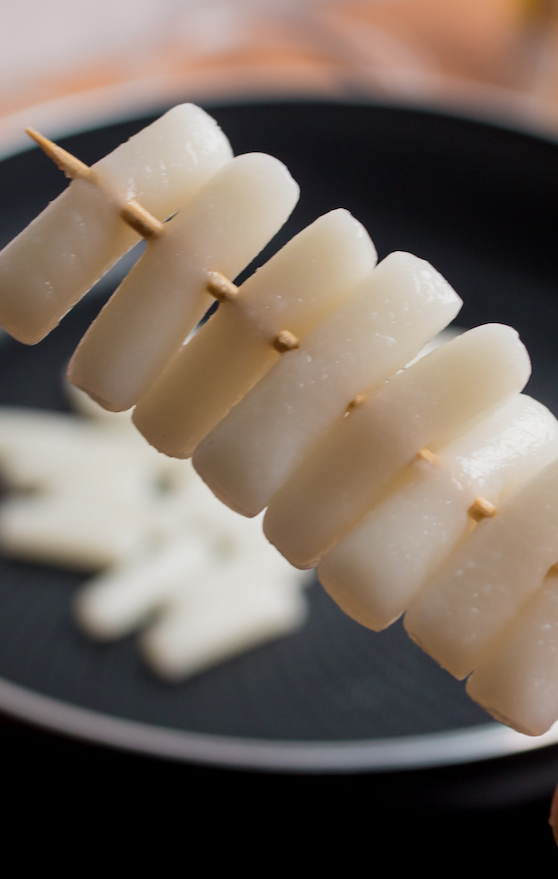 - Skewer the rice cakes, add oil to the frypan & sear the rice cake skewers until they look golden brown.