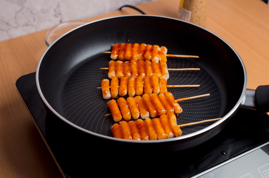 - Glaze the cooked Gochujang sauce over the rice cake skewers on both sides.